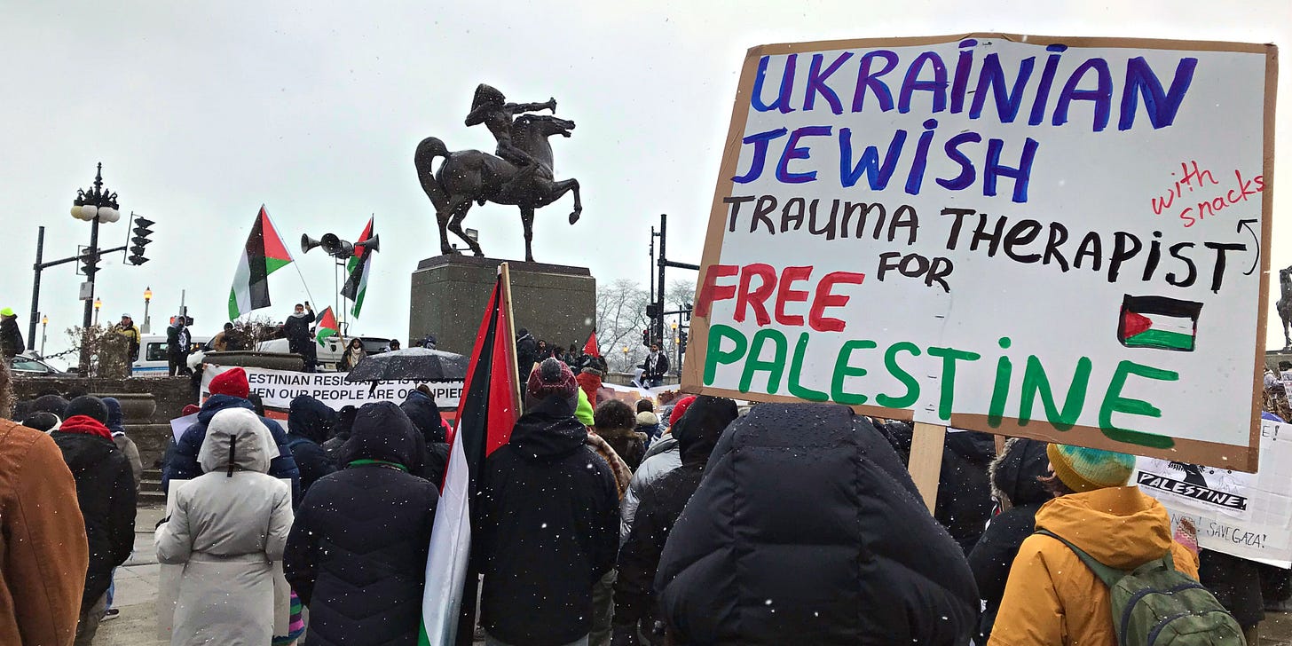 New Year’s Eve, 2023. It’s snowing. Nadia and I are at a Free Palestine rally in downtown Chicago. She holds a hand painted sign that reads “UKRAINIAN JEWISH TRAUMA THERAPIST FOR FREE PALESTINE … with snacks.”
